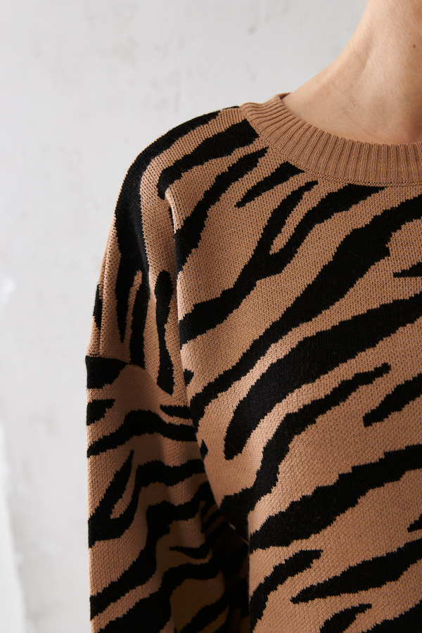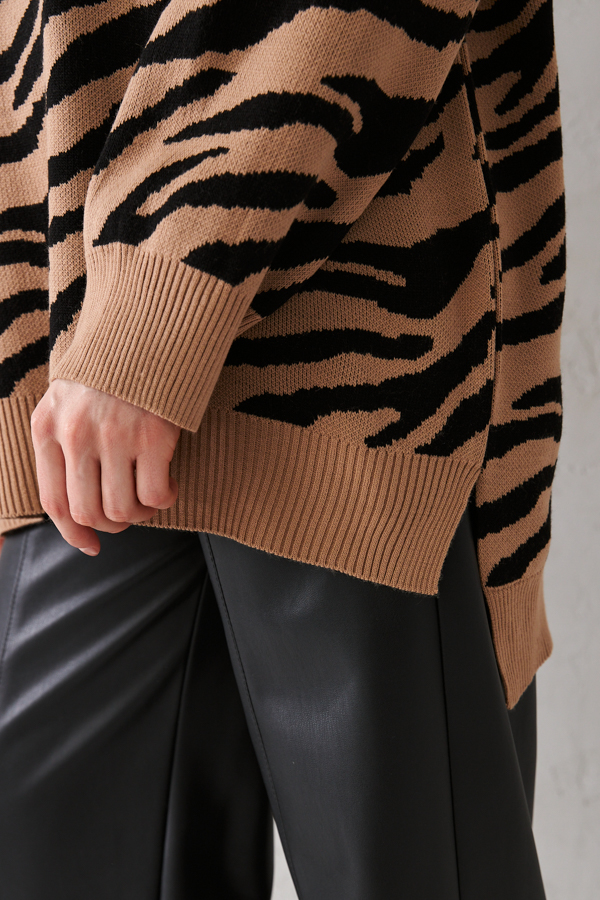Джемпер очень свободного силуэта со спущенной линией плеча и длинным рукавом. Низ изделия асимметричной длины (спинка удлинена относительно переда) с разрезами по бокам. Круглый вырез горловины, низ изделия и низ рукава оформлены резинкой. Изделие выполнено из мягкой структурированной пряжи.