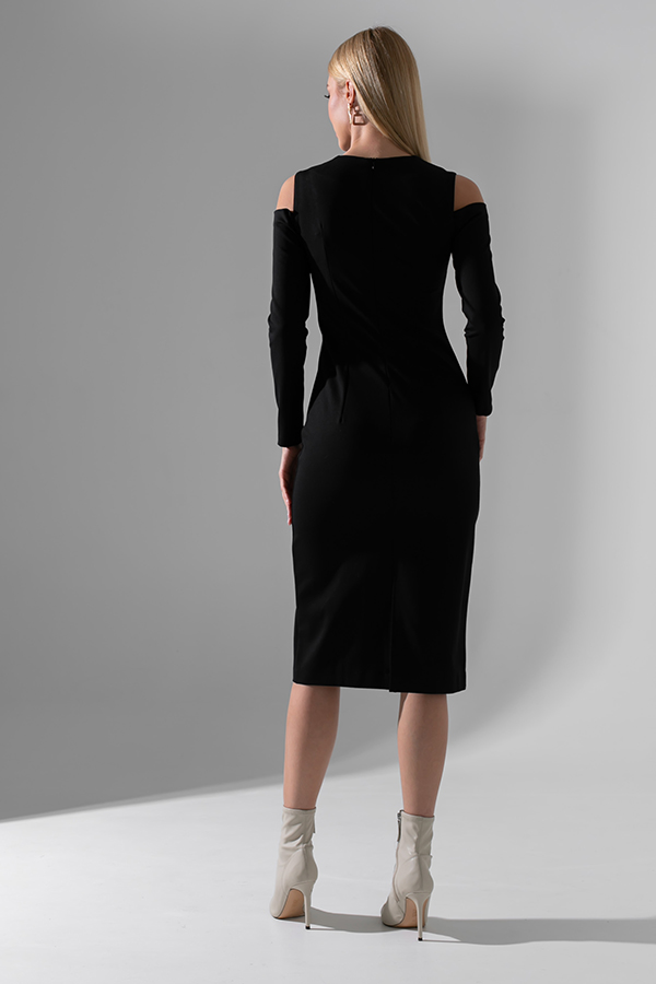 Платье прилегающего силуэта из эластичного полотна. Круглый вырез горловины. На задней части изделия застежка-молния, снизу выполнен разрез. Втачной длинный рукав, с вырезами на плечах.