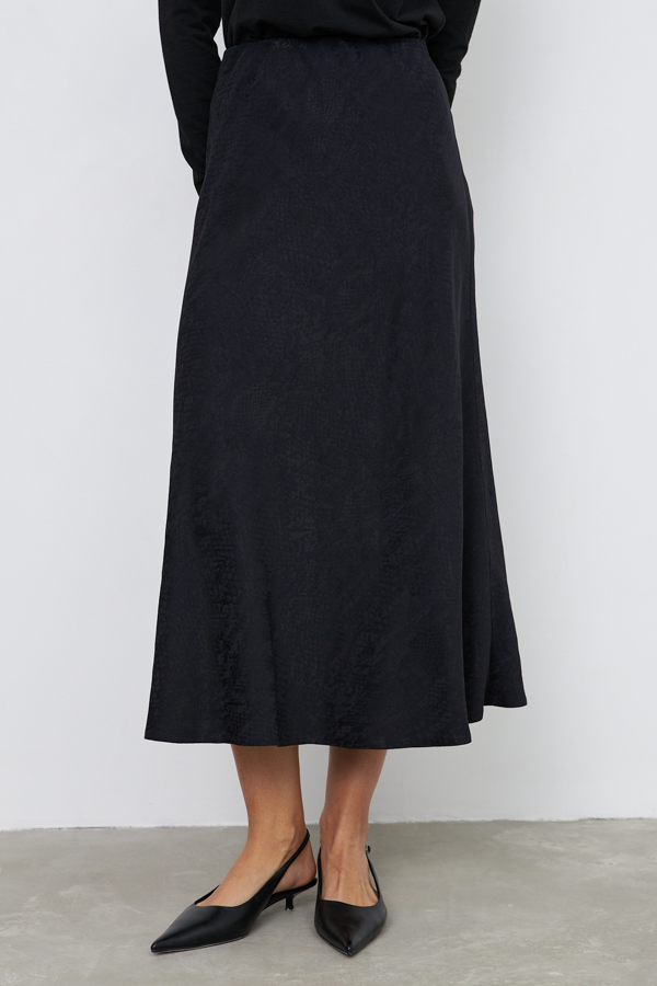 Юбка, слегка расширенная книзу из вискозной ткани с вытканным жаккардовым узором "рептилия". Крой юбки по косой, на линии талии скрытая резинка.