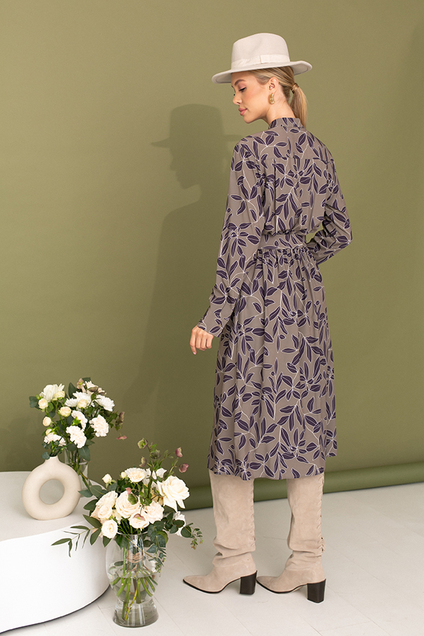 Платье свободного силуэта из плательной ткани. Изделие отрезное по линии талии с резинкой. Лиф платья с запахом, фиксируется на пуговицу для удобства. На передней части юбки выполнена складка, имитирующая запах, в боковых швах карманы. Линия горловины оформлена воротником-стойкой. Втачной длинный рукав с манжетой, застегивающейся на пуговицу. В комплекте пояс из основной ткани.