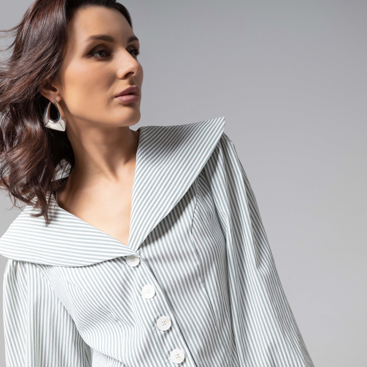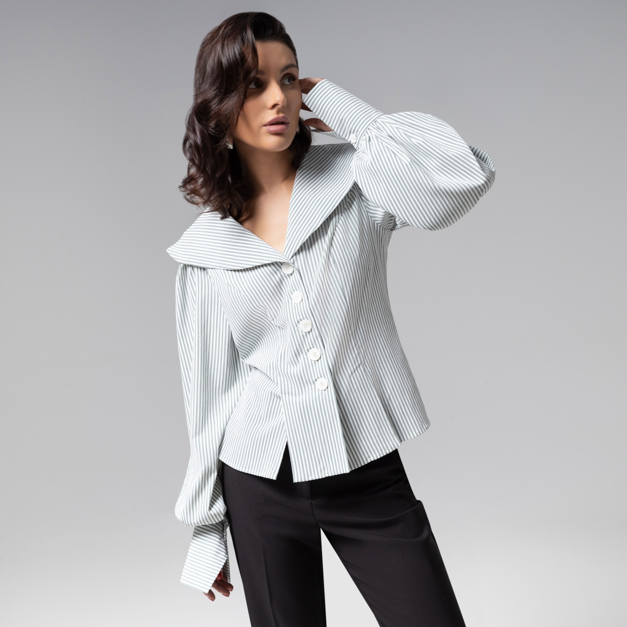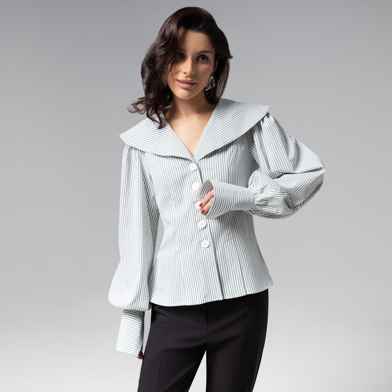 Изысканный приталенный силуэт блузы ЧАРУТТИ приковывает внимание. Широкий воротник, воздушные рукава изделия создают привлекательную игру контрастов. Изделие из премиального смыслового материала, который не потеряет своих свойств после многократных стирок. Безупречный пошив с идеальной посадкой по фигуре демонстрирует мастерство конструкторской мысли и внимание к каждой детали – от разрезов на подоле до оттенка пуговиц. Тонкая полоска на ткани придает образу утонченную глубину, делая блузу универсальным решением как для офиса, так и для светских выходов. Блуза коллекции PREMIUM – воплощение тихой роскоши, где сдержанность кроя встречается с безупречным чувством стиля.