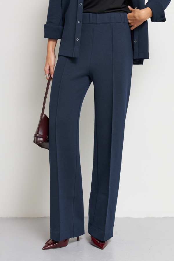 Брюки выполнены из эластичного полотна. Брюки прямого силуэта. Пояс притачной с эластичной резиной. На передней части брюк застрочены стрелки.