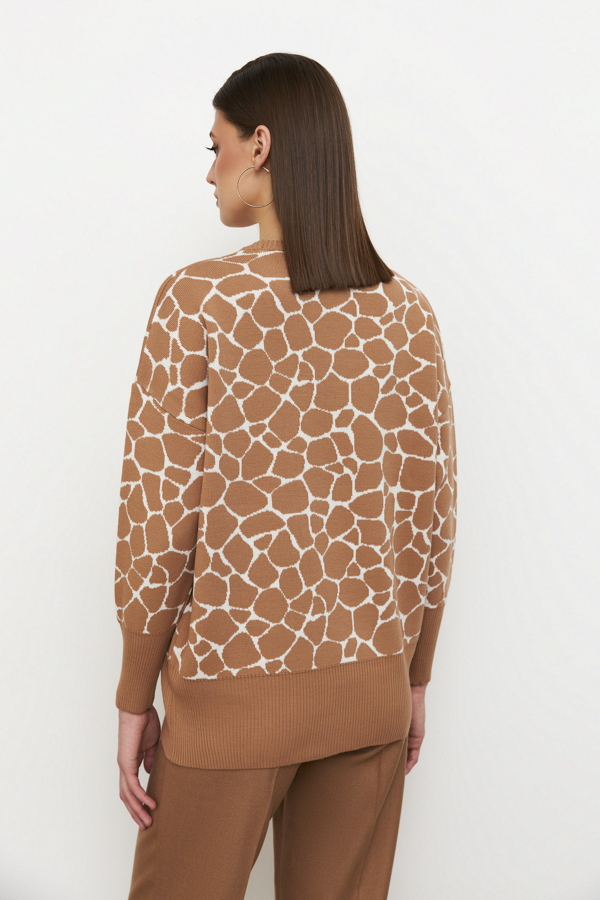 Джемпер свободного силуэта со спущенной линией плеча и длинным рукавом. Круглый вырез горловины оформлен резинкой, низ изделия и низ рукава-высокой резинкой. Изделие выполнено из мягкой структурированной пряжи.