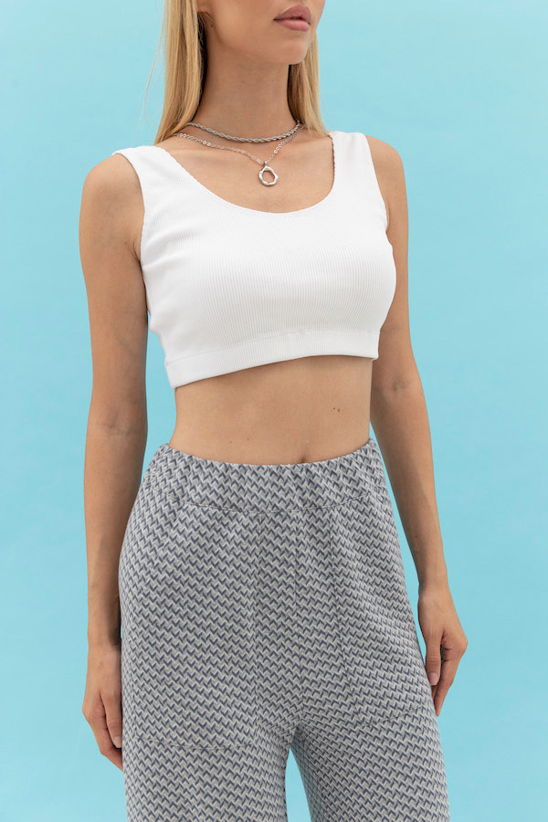 Брюки прямого силуэта из эластичного полотна с жаккардовым узором. Пояс притачной с эластичной резиной. На передней части брюк выполнены накладные карманы.