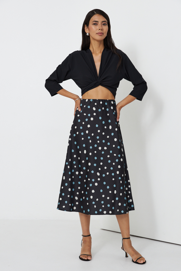Юбка, слегка расширенная книзу из атласной ткани. Крой юбки по косой, на линии талии скрытая резинка.
