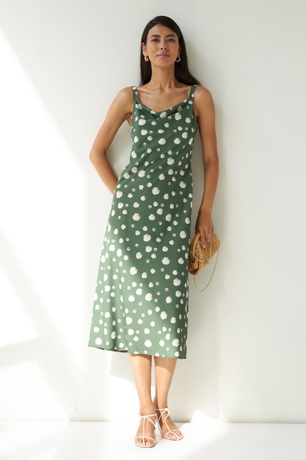 Платье с «качелями» в зоне декольте смотрится очень женственно. Изделие на бретелях полуприлегающего силуэта, расширенное книзу из плательной ткани.