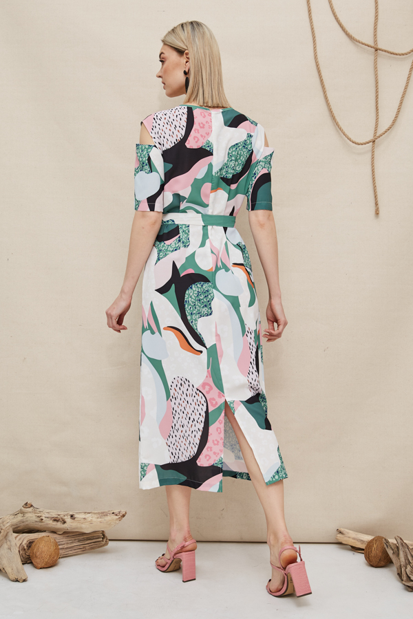 Платье свободного силуэта из плательной ткани. Круглый вырез горловины оформлен косой бейкой. На задней части изделия застежка-пуговица, снизу выполнен разрез. Втачной короткий рукав, с вырезами на плечах. В комплекте пояс из основной ткани.