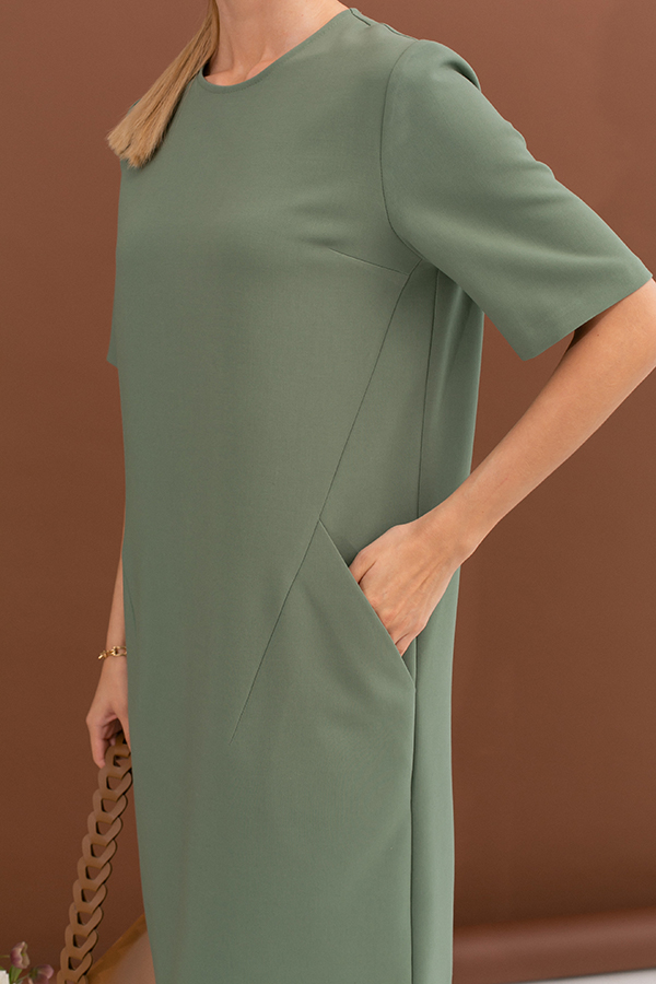 Платье свободного силуэта из плательной ткани. На передней части изделия выполнены декоративные рельефы и карманы. Втачной короткий рукав. Круглый вырез горловины, по среднему шву спинки застёжка на молнию.