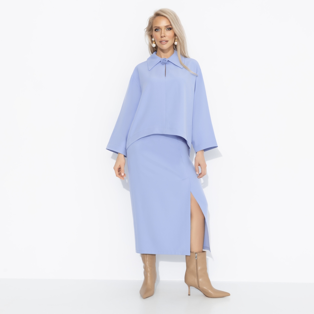 Идеальный небесно-лавандовый оттенок, созданный, чтобы добавить жизни в зимний гардероб. Этот сет ЧАРУТТИ хочется надеть в день, когда вместе с любимым вы отправляетесь на шопинг – выбирать подарки, смеяться, пробовать пирожные и ловить взгляды друг друга в отражениях витрин. С таким костюмом даже морозная зима кажется теплее и романтичнее. Свободный крой, утончённая юбка с разрезом, настроение для ярких зимних дней!