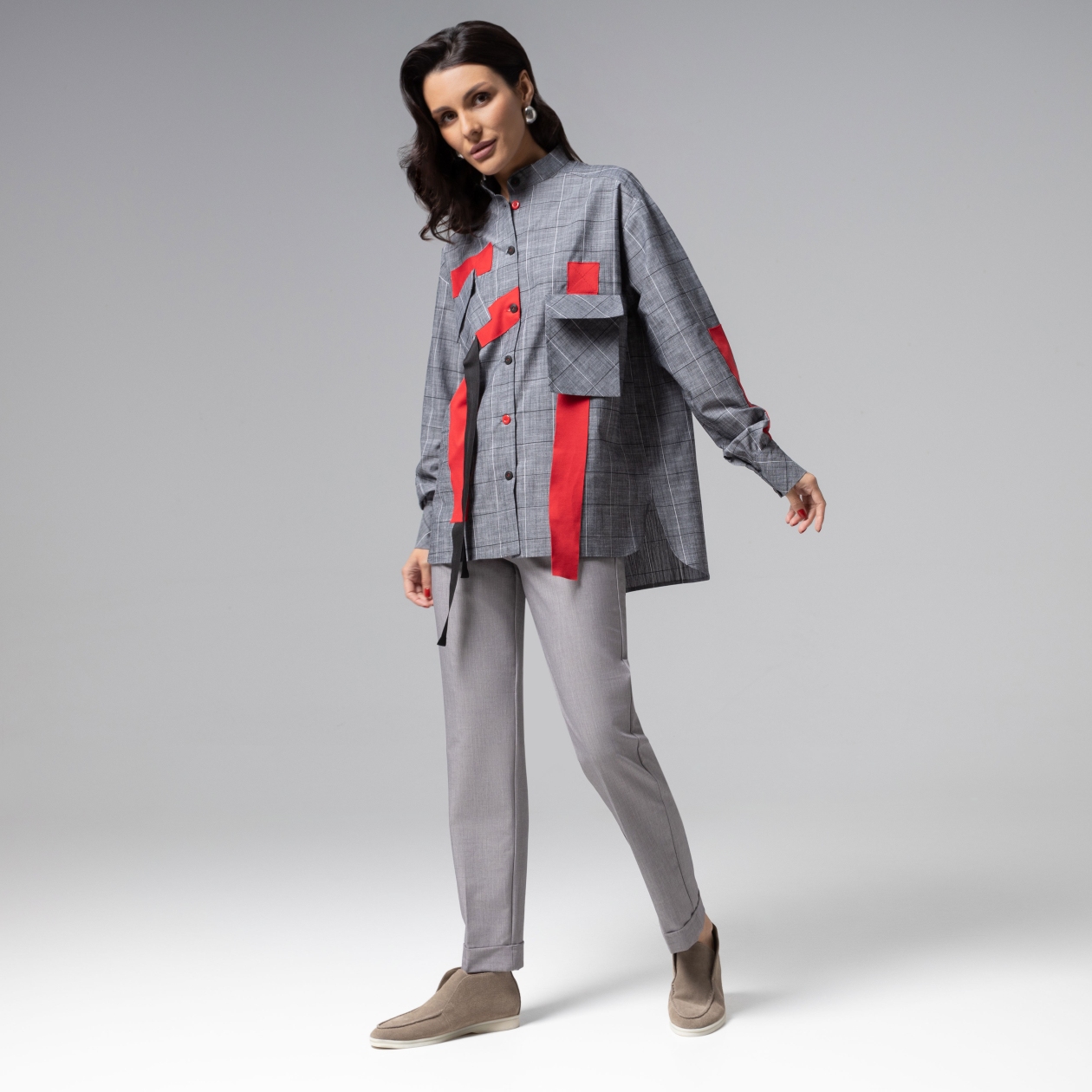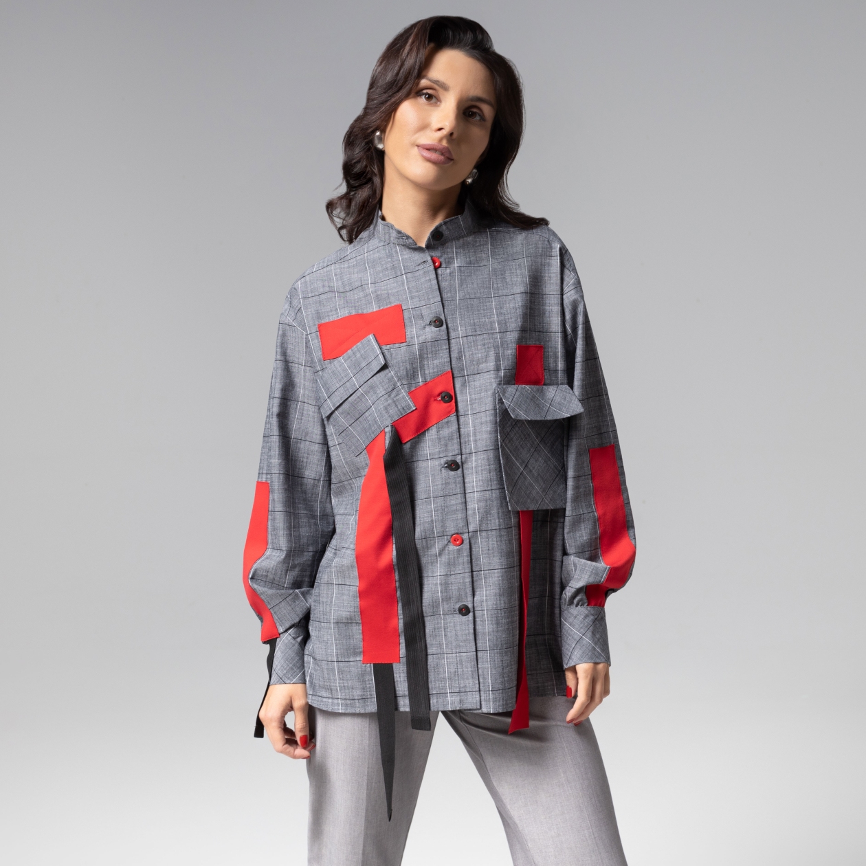 Элегантное противостояние традициям в рубашке ЧАРУТТИ. Асимметричные ленты радикального красного цвета разрезают серый холст хлопка премиального качества. Это модный манифест против канонов классического стиля. Смещенные карманы бросают вызов симметрии, превращая утилитарные детали в элементы концептуального искусства. Игра пропорций подчеркивается свободным силуэтом, где нарочитая небрежность кроя скрывает выверенную точность конструкторского расчета.