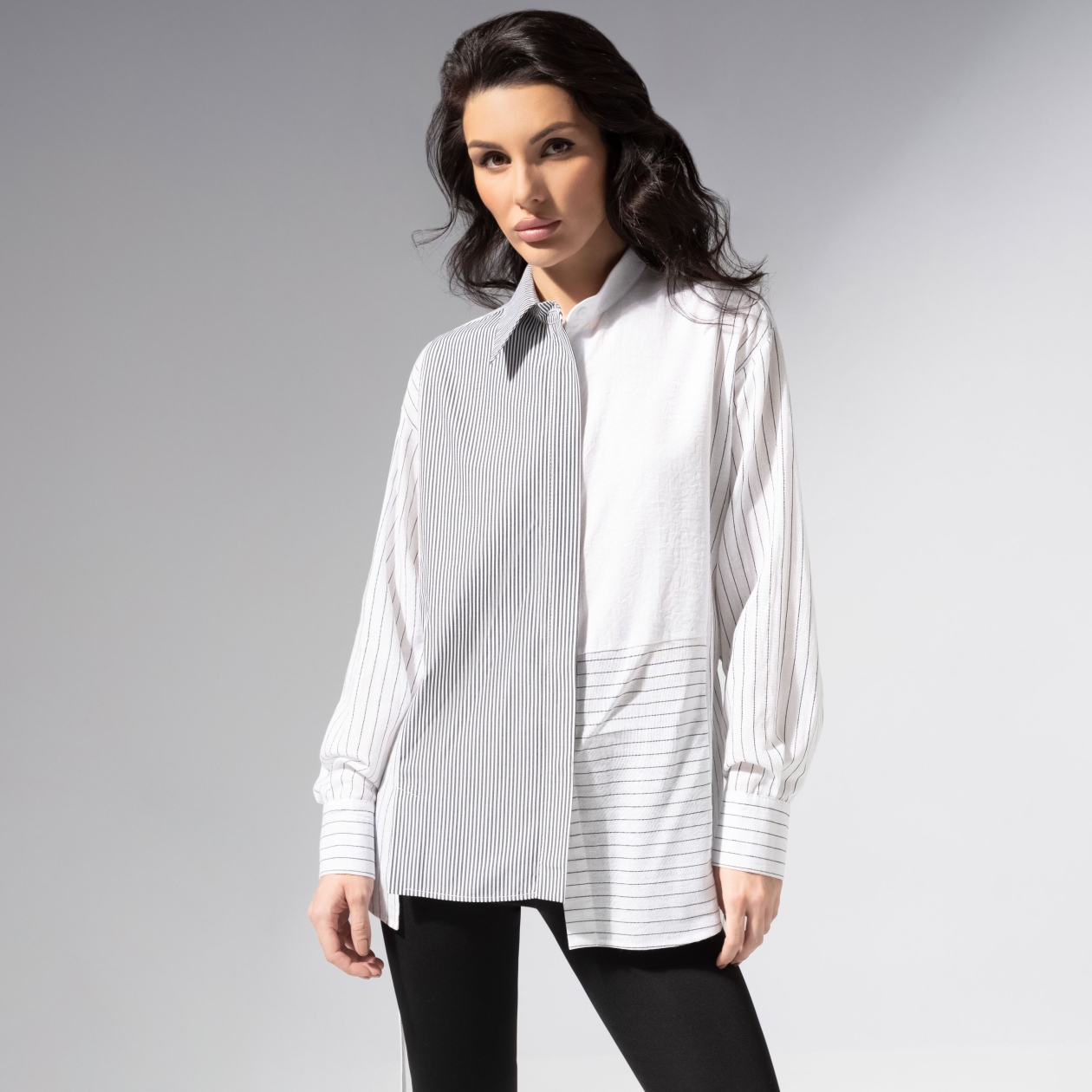 Стиль power dressing в утончённом исполнении. Рубашка ЧАРУТТИ будто соткана из уверенности и лёгкости. Контрастные полоски визуально вытягивают силуэт. Геометрия полос и безупречный крой превращают базовую вещь в модное высказывание. Двухфактурная рубашка с поясом. Свободный крой с акцентом на талию за счёт пояса. Длинный рукав, манжеты на пуговицах.