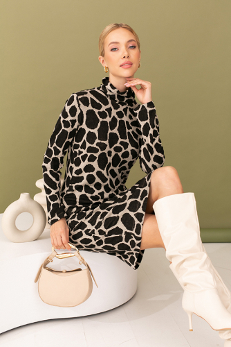 Платье прямого силуэта из эластичного полотна с жаккардовым анималистичным узором. Глубокий V-образный вырез горловины плавно переходит в запах, фиксируется притачным поясом. Втачной длинный рукав.