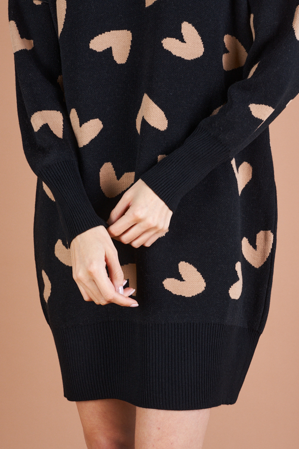 Платье свободного силуэта с узором «сердечки» на передней части. Изделие со спущенной линией плеча и длинным рукавом. Низ изделия и низ рукава с высокой резинкой. Круглый вырез горловины оформлен резинкой-бейкой. Изделие выполнено из мягкой структурированной пряжи.