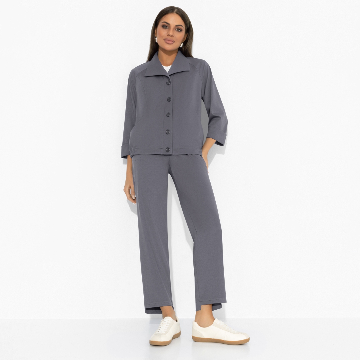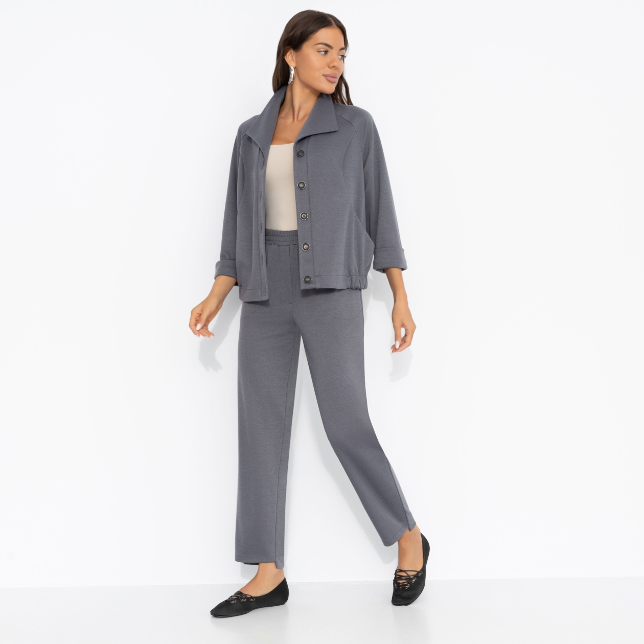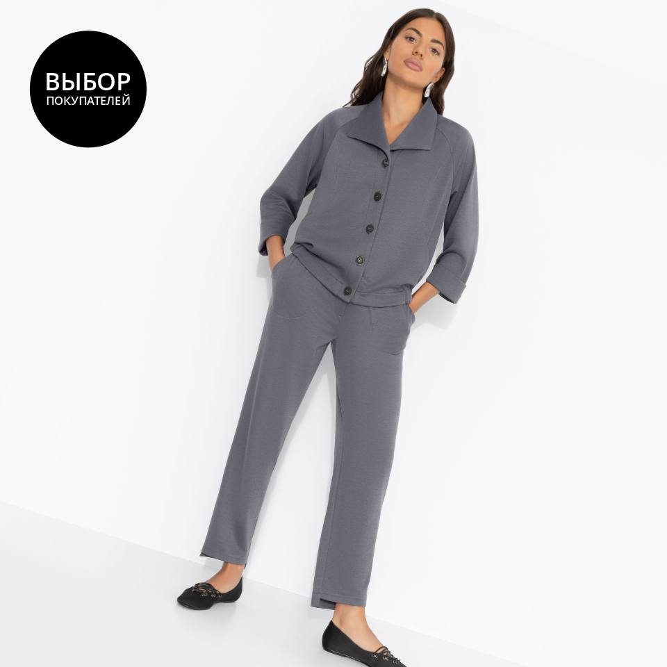 Костюм ЧАРУТТИ в тренде осознанности. Комфорт и забота о себе, как часть личностного бренда. Глубокий серый цвет подсвечивает природную красоту и делает костюм незаменим для активной городской жительницы. Комплект состоит из жакета-бомбера и укороченных брюк с асимметричным низом. Пояс брюк на широкой резинке. Изделие с карманами. Жакет застегивается на пуговицы. Подол изделия оформлен резинкой. Рукава укорочены. Есть карманы.