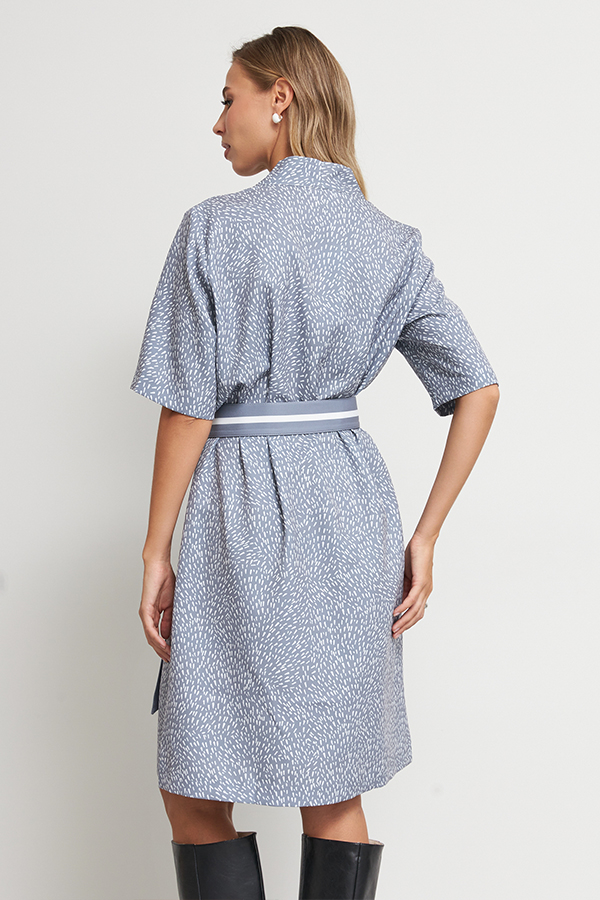 Платье свободного силуэта из плательной ткани. По центру передней части изделия выполнен шов. Цельнокроеная стойка, переходящая в V-образный вырез горловины, визуально делает фигуру стройнее. Втачной короткий рукав.