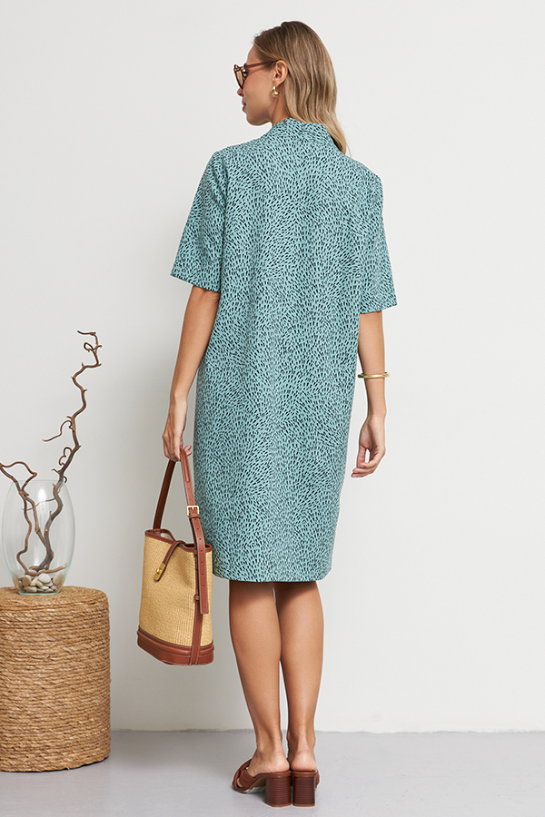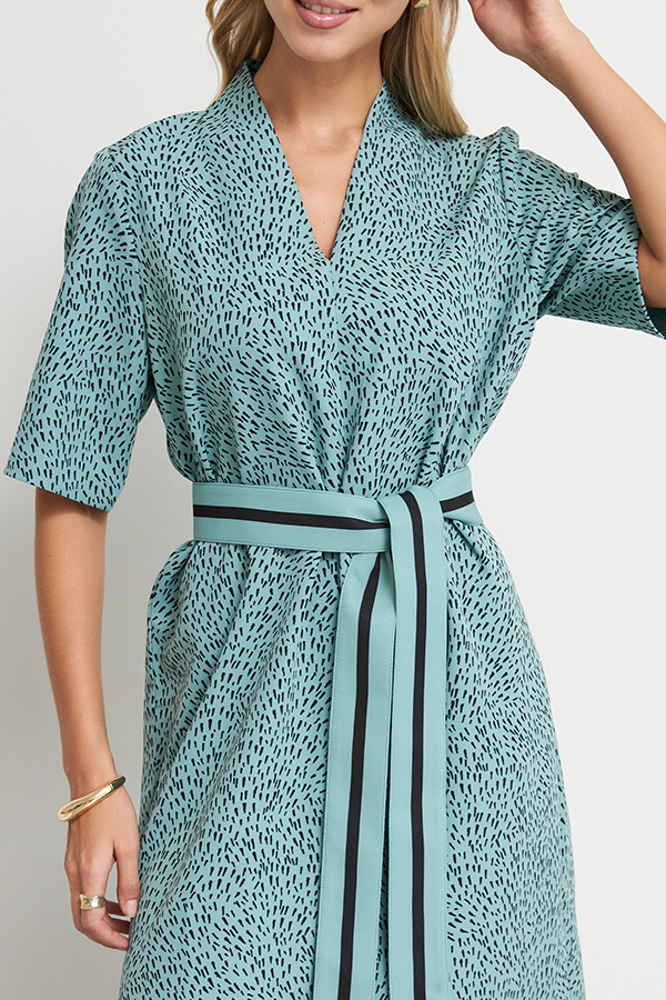 Платье свободного силуэта из плательной ткани. По центру передней части изделия выполнен шов. Цельнокроеная стойка, переходящая в V-образный вырез горловины, визуально делает фигуру стройнее. Втачной короткий рукав.