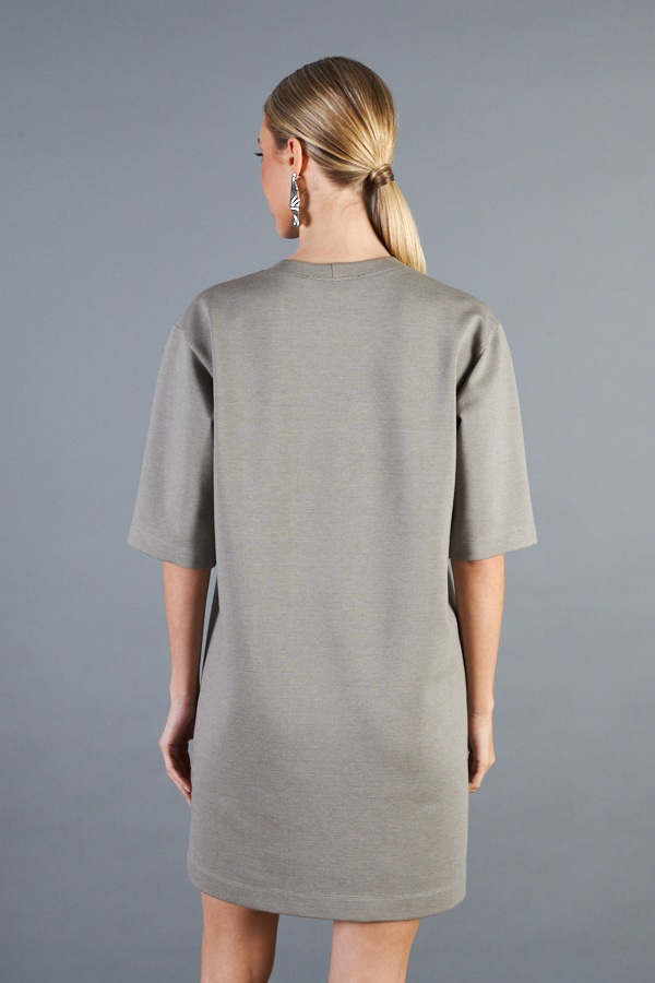 Платье свободного силуэта из эластичного полотна. Короткий втачной рукав в спущенную пройму. Вырез горловины оформлен бейкой. На передней части изделия выполнена аппликация.