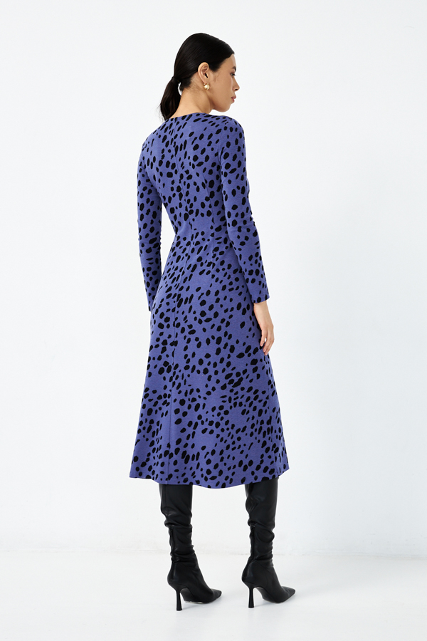 Платье полуприлегающего силуэта, расширенное книзу из эластичного полотна с жаккардовым узором. Боковые швы смещены в сторону переда. На передней части, ниже линии груди, выполнены рельефы. Линия рельефа начинается от выреза горловины и заканчивается в боковом шве на уровне выше линии талии. V- образный вырез горловины. Спинка со средним швом и талиевыми вытачками. Втачной длинный рукав.