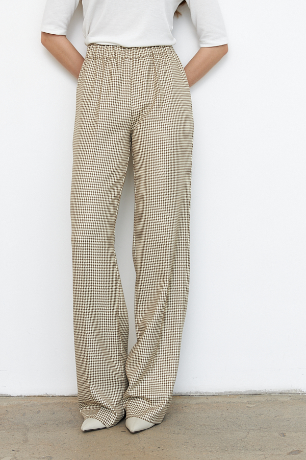 Брюки прямого силуэта из костюмной ткани. Пояс притачной с эластичной резиной.