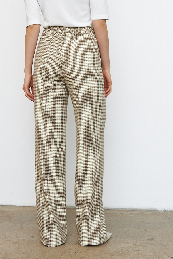 Брюки прямого силуэта из костюмной ткани. Пояс притачной с эластичной резиной.
