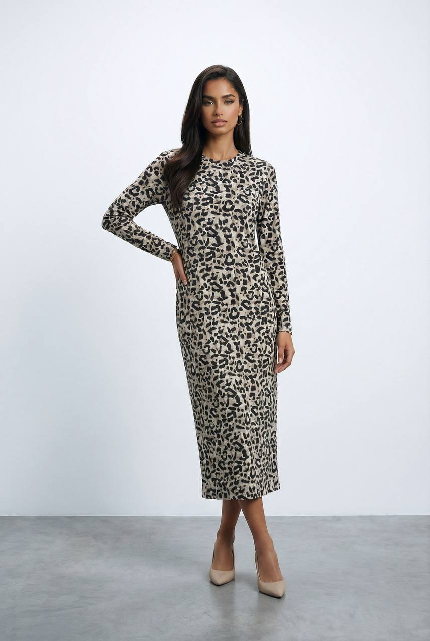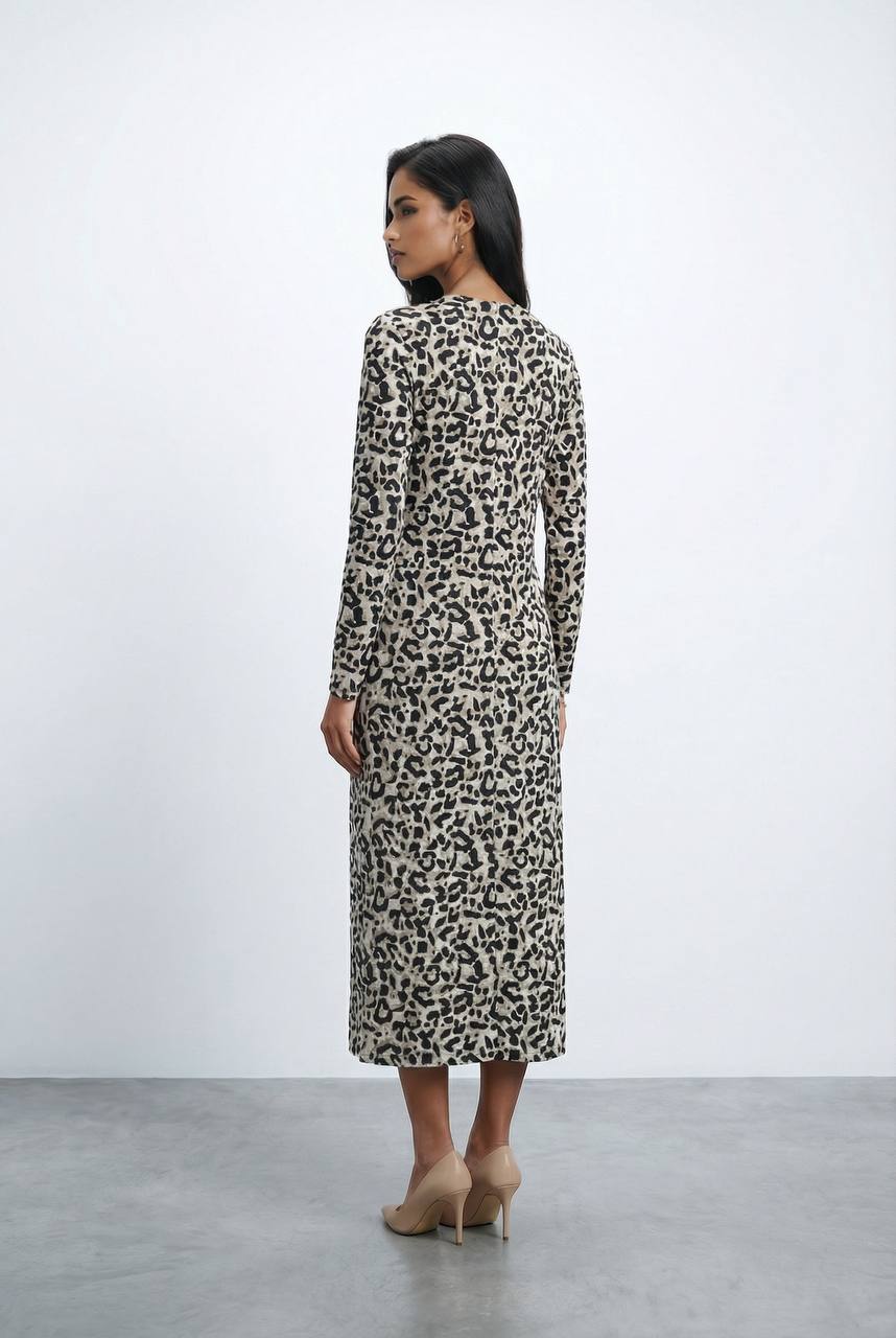 Платье полуприлегающего силуэта из эластичного полотна. Круглый вырез горловины оформлен притачной бейкой. Втачной длинный рукав.
