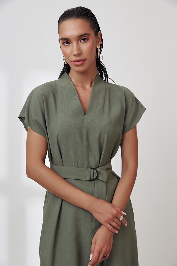 Платье из вискозной ткани с крэш-эффектом. Свободный силуэт с карманами в боковых швах. По центру передней и задней части изделия выполнен шов. Цельнокроеная стойка, переходящая в V-образный вырез горловины, визуально делает фигуру стройнее. Цельнокроеный короткий рукав. В комплекте пояс из основной ткани.