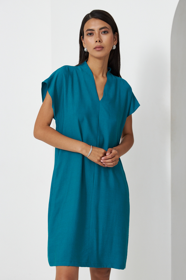 Платье из вискозной ткани с крэш-эффектом. Свободный силуэт с карманами в боковых швах. По центру передней и задней части изделия выполнен шов. Цельнокроеная стойка, переходящая в V-образный вырез горловины, визуально делает фигуру стройнее. Цельнокроеный короткий рукав. В комплекте пояс из основной ткани.