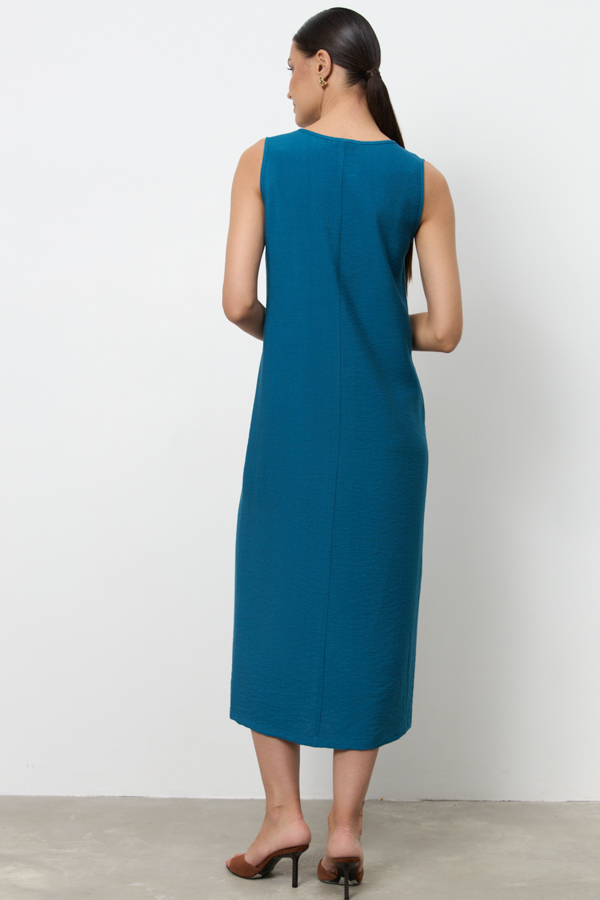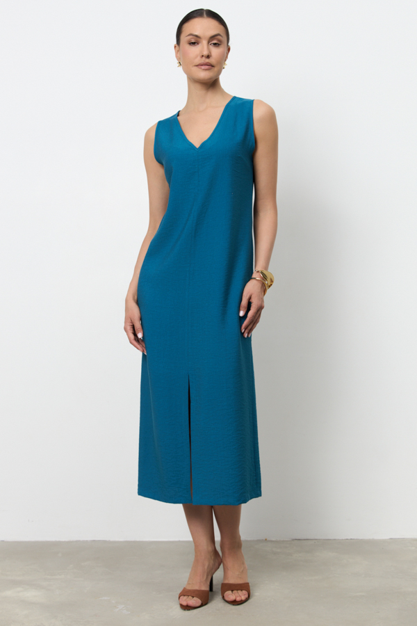 Платье из вискозной ткани с крэш-эффектом полуприлегающего силуэта. По центру передней части изделия выполнен шов, снизу разрез. V-образный вырез горловины и линия проймы оформлены косыми бейками.