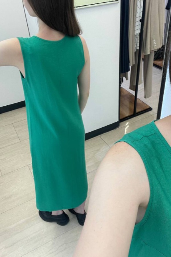 Платье из вискозной ткани с крэш-эффектом полуприлегающего силуэта. По центру передней части изделия выполнен шов, снизу разрез. V-образный вырез горловины и линия проймы оформлены косыми бейками.