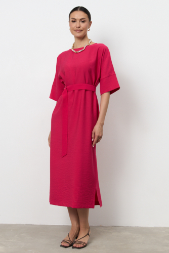 Платье из вискозной ткани с крэш-эффектом полуприлегающего силуэта. По центру передней части изделия выполнен шов, снизу разрез. V-образный вырез горловины и линия проймы оформлены косыми бейками.