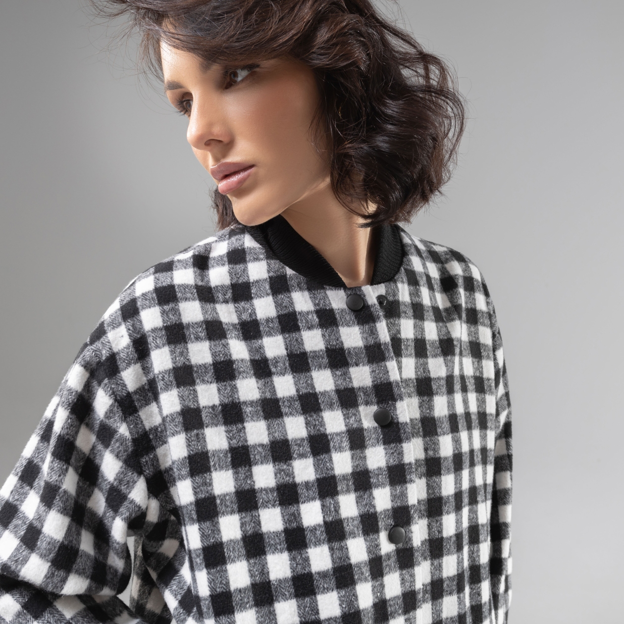 Бомбер «Движение вперед (интересная штучка)» — это не просто элемент гардероба, а воплощение стиля и интеллекта. Легкий, но теплый, он идеально подходит для осенних прогулок и уютных вечеров. Черно-белая клетка привлекает внимание своей элегантностью, создавая образ уверенной в себе женщины. Этот женский бомбер из костюмной ткани — жаккард, трикотаж в рубчик и креп — не просто согреет вас в прохладные дни, но и станет вашим стильным спутником. Его объемный силуэт и идеальная посадка делают его незаменимым для тех, кто ценит комфорт и моду. Покупая оптом, вы получаете не только качество, но и возможность преобразить гардероб своих клиентов.