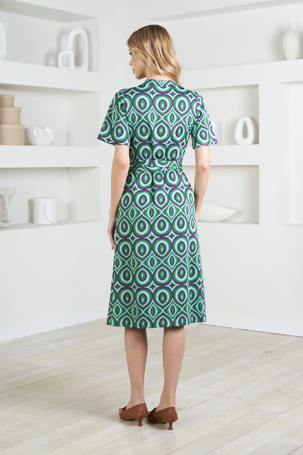Платье прямого силуэта из эластичного полотна с жаккардовым узором. Глубокий V-образный вырез горловины плавно переходит в запах, фиксируется притачным поясом. Втачной короткий рукав.