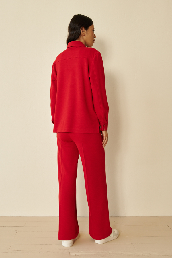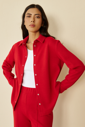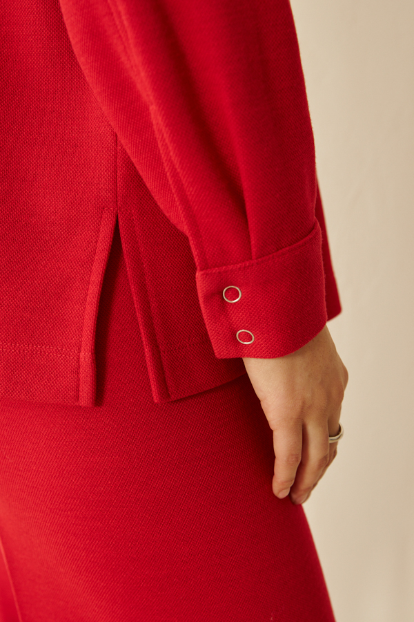 Жакет выполнен из эластичного полотна. Изделие в рубашечном стиле. Свободный силуэт с разрезами в боковых швах и застёжкой на планке. Вырез горловины обработан отложным воротником на стойке. Втачной рукав на манжете с застёжкой на кнопки.