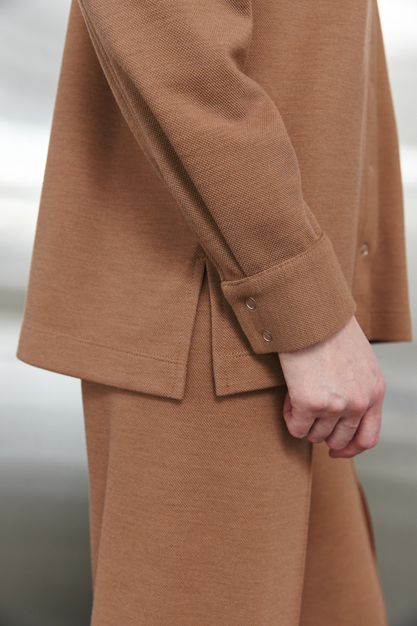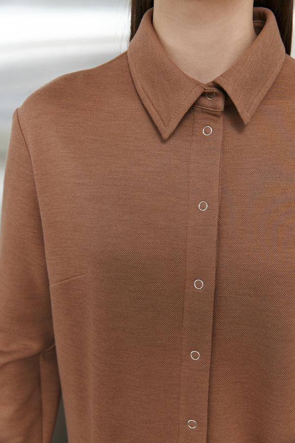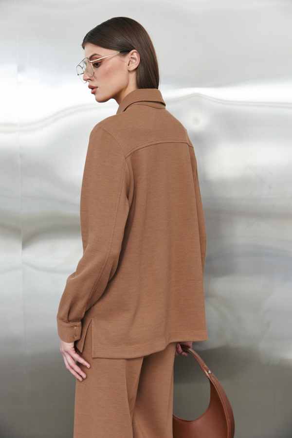 Жакет выполнен из эластичного полотна. Изделие в рубашечном стиле. Свободный силуэт с разрезами в боковых швах и застёжкой на планке. Вырез горловины обработан отложным воротником на стойке. Втачной рукав на манжете с застёжкой на кнопки.