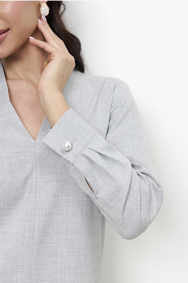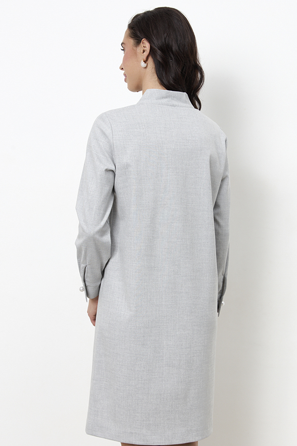 Платье свободного силуэта из плательной ткани. По центру передней части изделия выполнен шов. Цельнокроеная стойка, переходящая в V-образный вырез горловины, визуально делает фигуру стройнее. Втачной длинный рукав. Низ рукава на манжете с застёжкой на пуговицы-жемчужины.