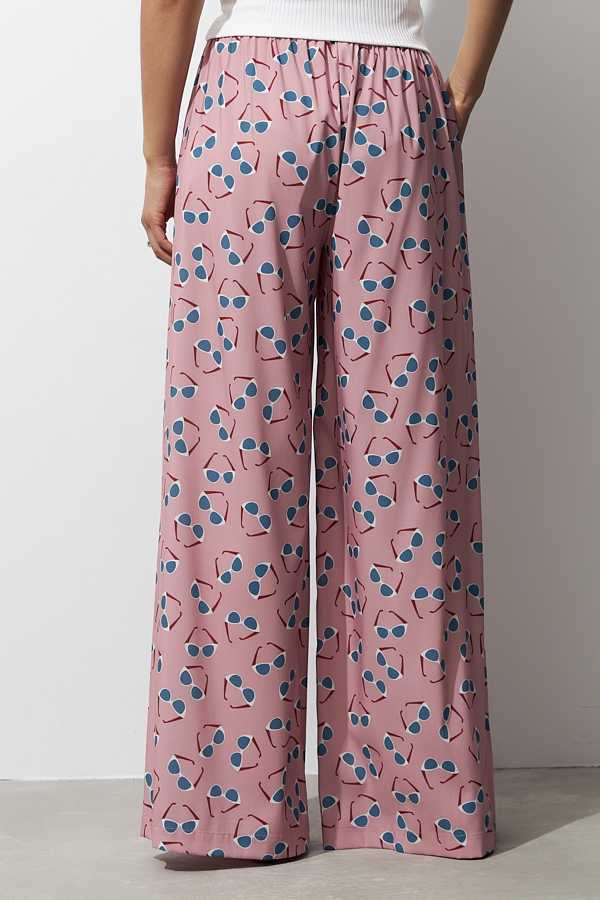 Брюки прямого свободного силуэта из вискозной ткани. Пояс притачной с эластичной резиной, в боковых швах карманы.