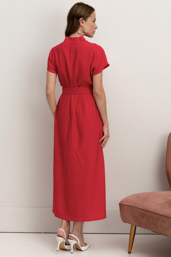 Платье из вискозной ткани с крэш-эффектом. Свободный силуэт, с разрезом в боковом шве. По центру передней и задней части изделия выполнен шов. Цельнокроеная стойка, переходящая в V-образный вырез горловины, визуально делает фигуру стройнее. Цельнокроеный короткий рукав. В комплекте пояс из основной ткани.