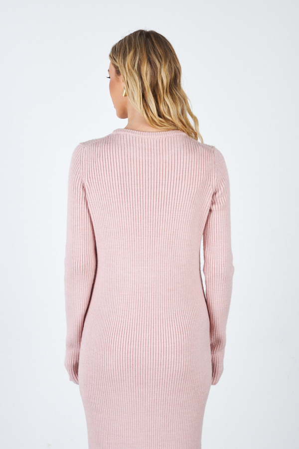 Платье прилегающего силуэта с рисунком в рубчик. Длинный втачной рукав. Круглый вырез горловины оформлен резинкой-бейкой. Изделие выполнено из мягкой пряжи.