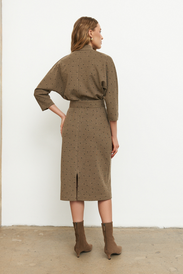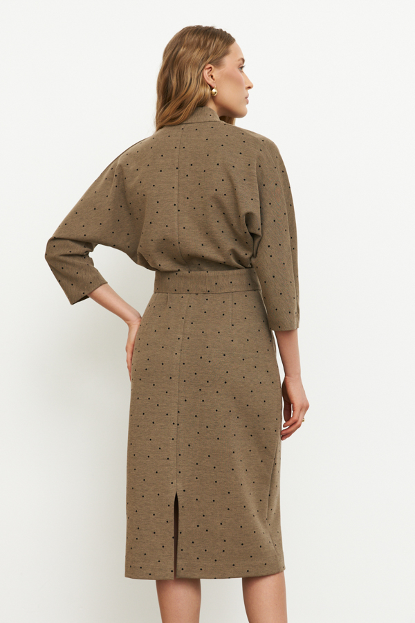 Платье из эластичного полотна с жаккардовым узором. Изделие свободное в верхней части и прилегающее в области талии и бёдер. Лиф изделия оригинального кроя в стиле кимоно. Цельнокроеная стойка переходящая в запах, визуально делает фигуру стройнее. По центру задней части платья выполнен шов, снизу небольшой разрез. В комплекте пояс. В таблице размеров представлены параметры человека, а не изделия.