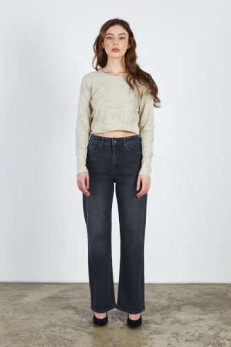 Брюки из эластичного денима зауженные книзу выполнены по классической джинсовой технологии (варка с эффектом легкого выбеливания). На задней части брюк выполнены накладные карманы, на передней- карманы с подкройным бочком. Притачной пояс со шлёвками. Застёжка на молнию-гульфик и пуговицу.