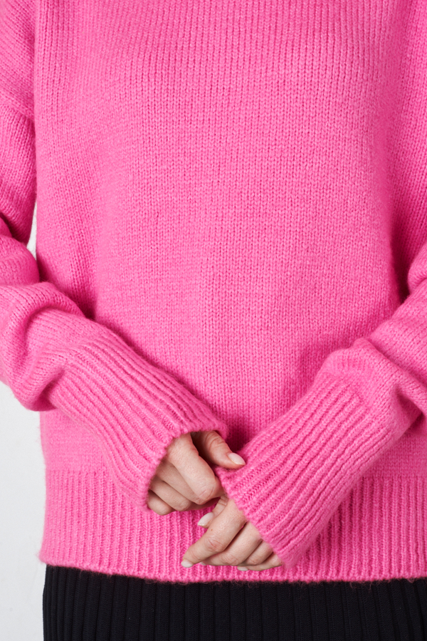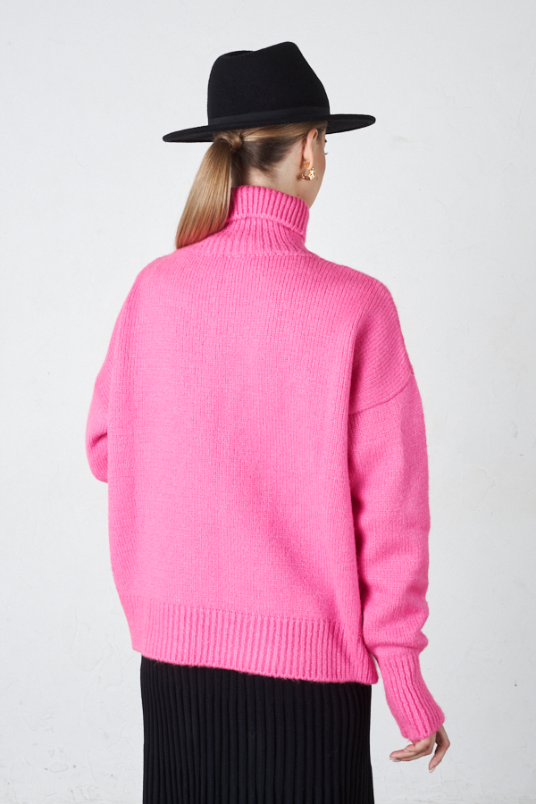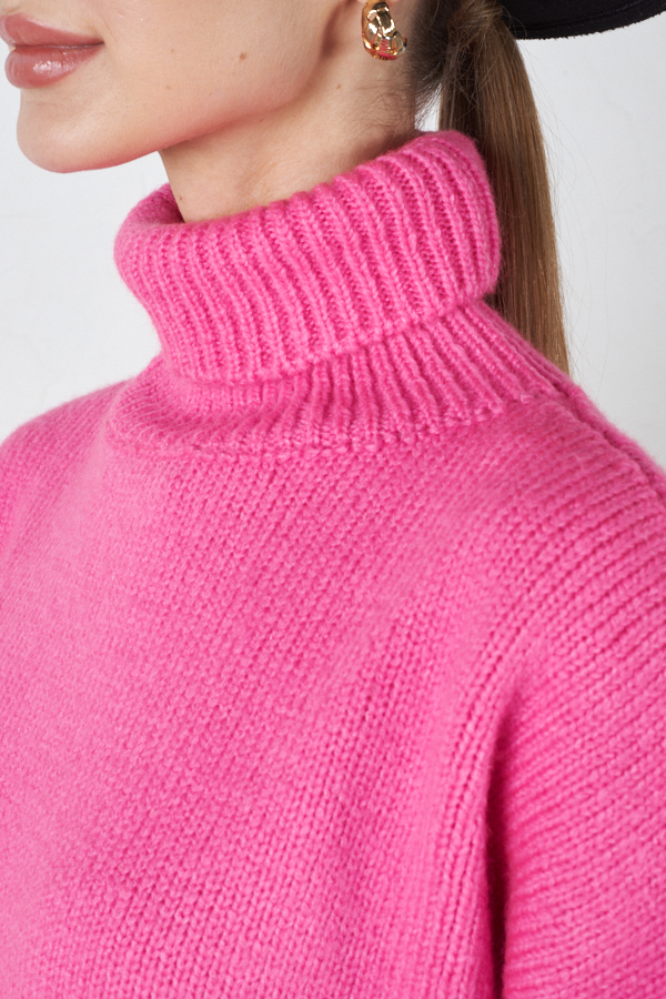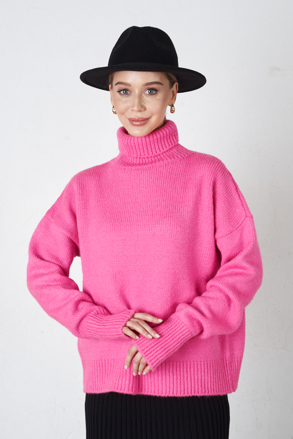 Джемпер свободного силуэта со спущенной линией плеча и длинным рукавом. Низ изделия и низ рукава оформлены резинкой, воротник-стойка с отворотом. Изделие выполнено из мягкой пряжи.