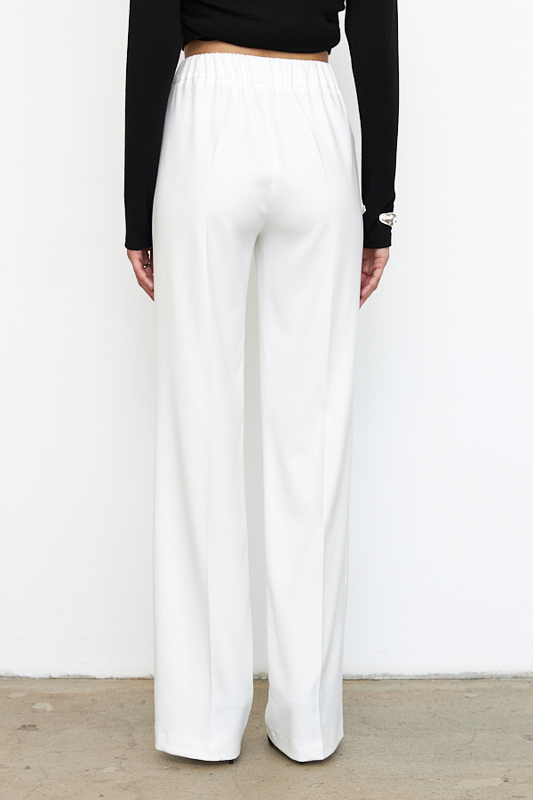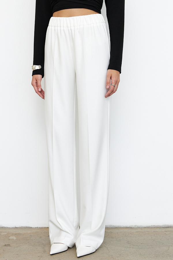 Брюки прямого силуэта из костюмной ткани. Пояс притачной с эластичной резиной.