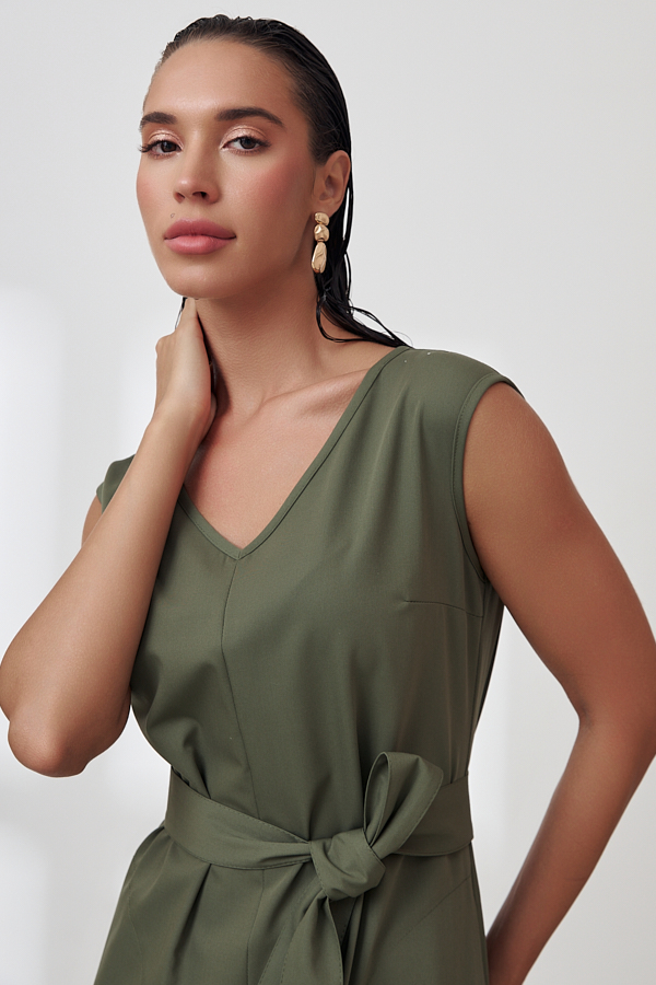 Платье полуприлегающего силуэта, чуть расширенное книзу из вискозной плательной ткани. По центру передней и задней части изделия выполнен шов. V-образный вырез горловины и линия проймы оформлены косыми бейками. Низ изделия асимметричной длины (спинка чуть удлинена относительно переда). В боковых швах карманы с настроченным контуром. В комплекте пояс из основной ткани.