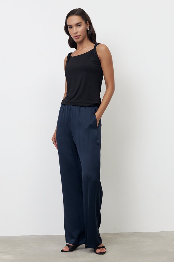 Брюки прямого силуэта из вискозной ткани с сатиновым блеском. Пояс притачной с эластичной резиной, в боковых швах карманы.