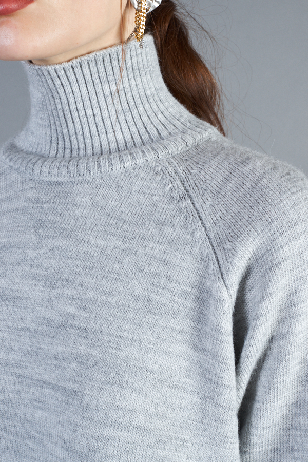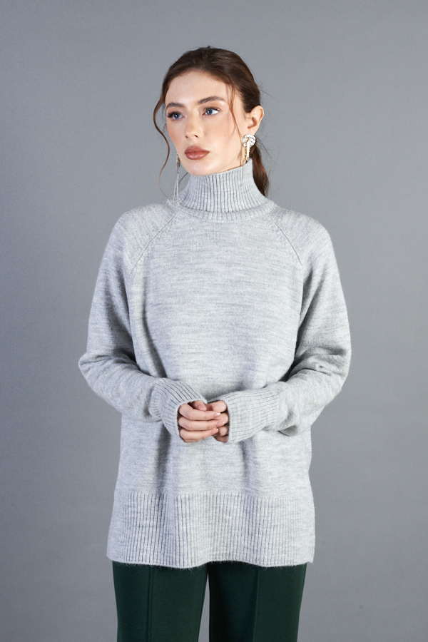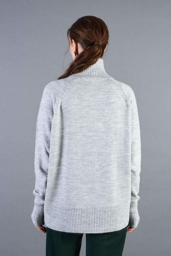 Джемпер свободного силуэта. Длинный рукав-реглан. Низ изделия и низ рукава оформлены резинкой, воротник-стойка. Изделие выполнено из мягкой меланжевой пряжи.