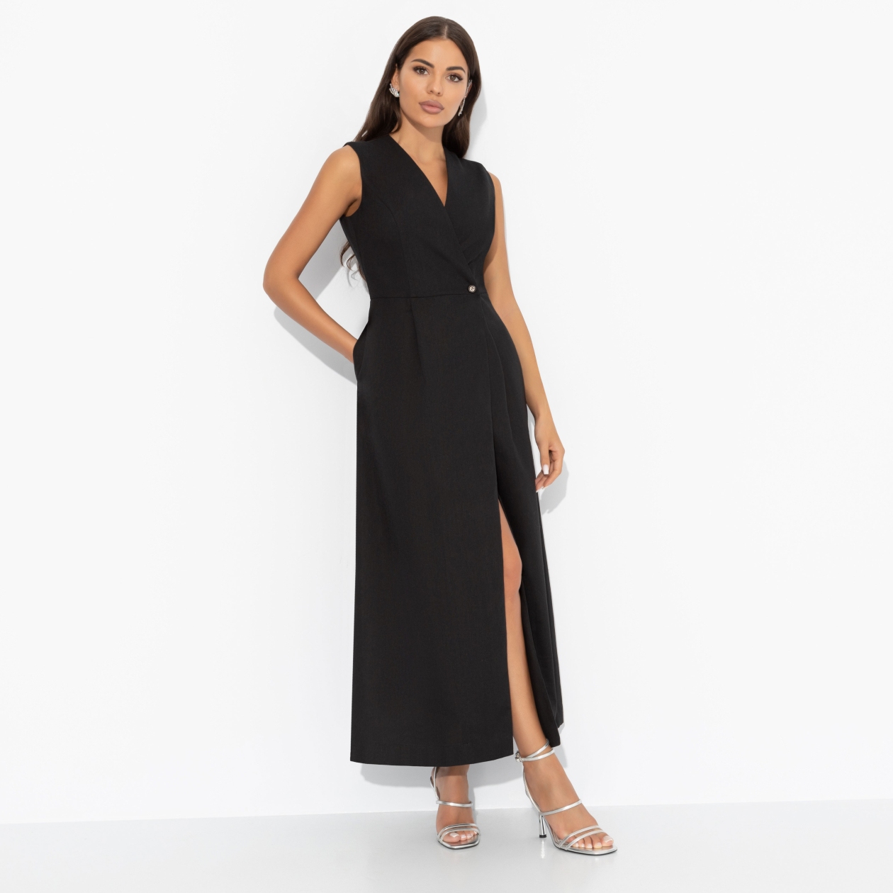 Минималистичность – это не синоним простоты. Это лаконичность, помноженная на роскошь. Элегантный образ может дать фору любым сложно скроенным изделиям. Платье CHARUTTI для яркого минималистичного самовыражения. Платье в длине макси. Есть карманы. Приталенный силуэт. Застегивается на пуговицу. За счет нахлеста есть глубокий разрез по юбке. Ткань может краситься, рекомендуем постирать перед ноской.