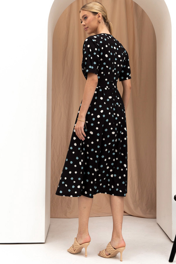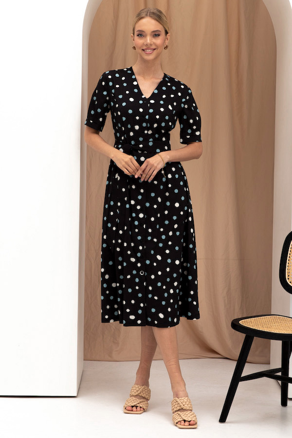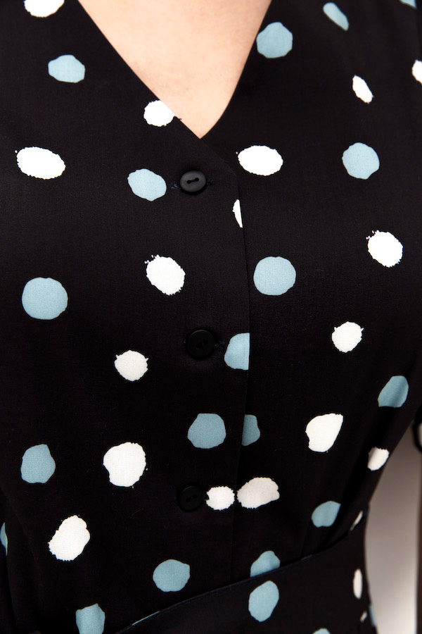 Платье из вискозной плательной ткани полуприлегающее в области груди и свободное в области бедер. Изделие отрезное по линии талии с застёжкой на пуговицы. В боковых швах карманы. V-образный вырез горловины, визуально делает фигуру стройнее. Втачной короткий рукав с защипами по низу рукава и манжетой. В комплекте пояс из основной ткани.