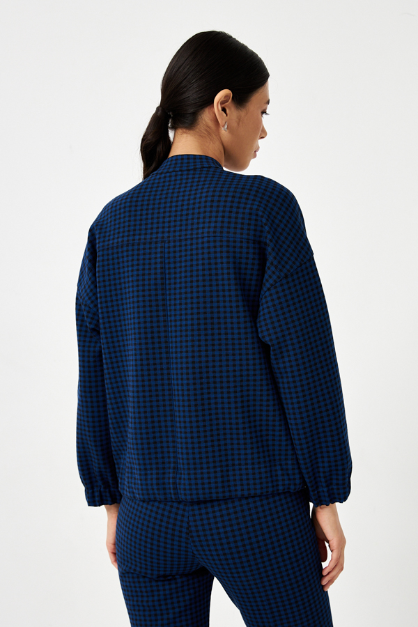 Жакет-бомбер выполнен из эластичного полотна с жаккардовым узором "клетка". Свободный силуэт с застёжкой-молнией и накладными карманами. Рукав втачной в спущенную пройму. Нижняя часть рукава и низ изделия присборены на резинку. Линия горловины оформлена воротником-стойкой.