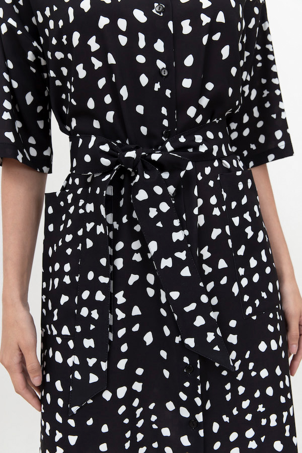 Платье-рубашка из плательной ткани свободного силуэта с застёжкой на кнопки. Короткий втачной рукав в спущенную пройму. Вырез горловины обработан отложным воротником на стойке. На передней части изделия выполнены накладные карманы. В комплекте пояс из основной ткани.
