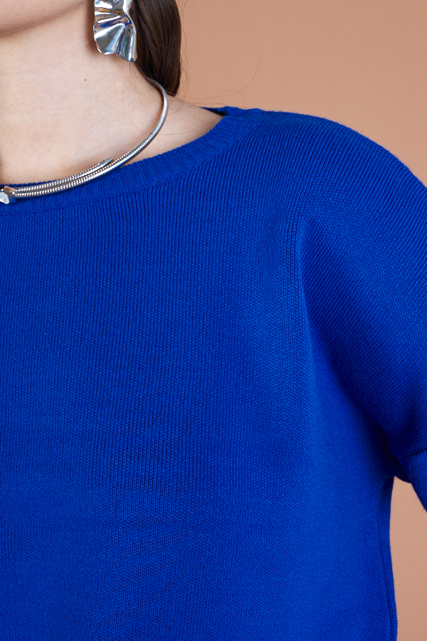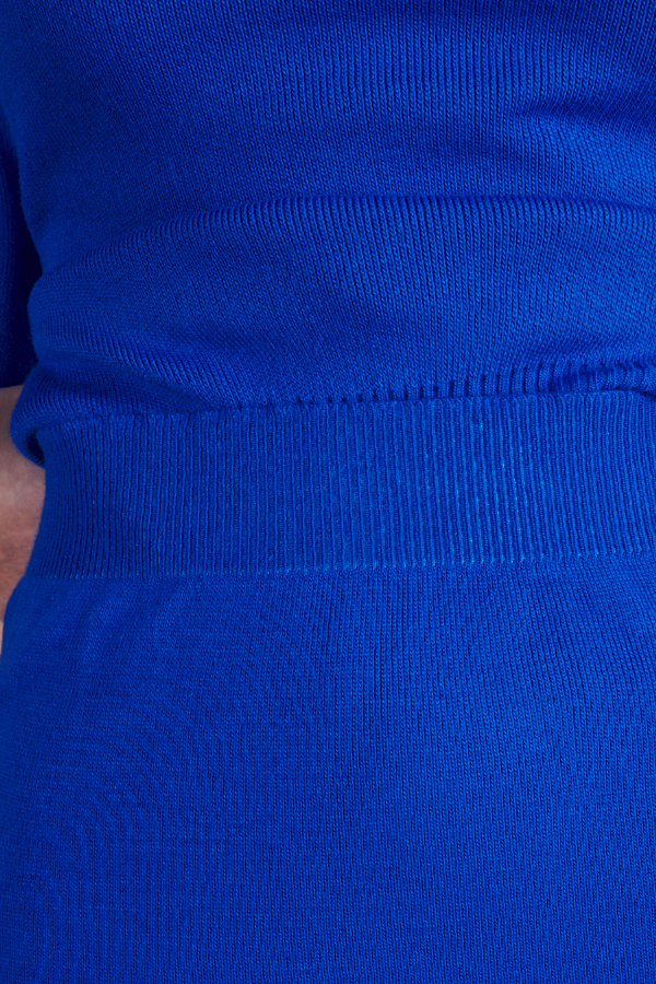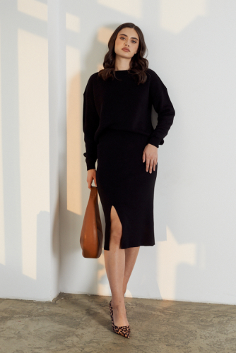 Костюм из джемпера и юбки. Джемпер свободного силуэта со спущенной линией плеча и длинным рукавом. Круглый вырез горловины, низ изделия и низ рукава оформлены резинкой. Юбка прилегающего силуэта, зауженная книзу. Пояс с эластичной резиной обеспечивает хорошую посадку по фигуре. На переднем полотнище юбки асимметричный разрез. Изделие выполнено из мягкой структурированной пряжи.